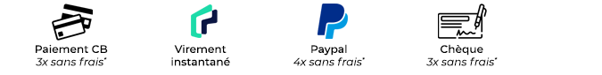 Par CB en 2x, 3x, 4x ou 10x de 50€ à 4000€ d'achat. Par chèques de 599€ à 3000€ d'achat.