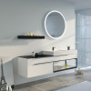 Chez Distribain, comble du pratique avec son étagère et sa niche de rangement, l'alliance des différentes matières et son design original, le meuble de salle de bain Eleganzza Blanc est un incontournable. Il se compose d'un miroir rond rétro éclairé, d'un meuble suspendu de 180 cm, et d'une étagère très pratique. Le verre noir de son plan vasque contraste avec style avec le blanc mat de l'ensemble et de sa vasque en solid surface. En outre, il dispose d'une niche ouverte où vous rangerez décoration ou linge de bain.