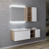 Son design alliant originalité et esthétisme avec sa courbe et son double ton bois scandinave blanc glossy vous séduira à coup sûr. L'ensemble de meubles est complété avec un grand miroir avec éclairage à LED intégré et interrupteur tactile rétro-éclairé. La vasque en résine minérale haute qualité (Solid Surface) est livrée avec sa bonde push&up. Les meubles sont équipés du système Soft Closing (fermeture douce).